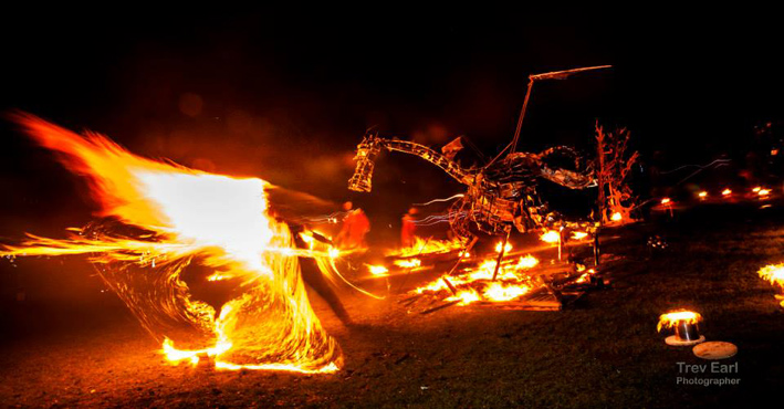 Fire sword fights, Stilt Walking, acrobatics and choreographed fire routines.