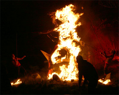 town's riverside. Flanked by fire-eaters, flame dancers, jesters, pipe players