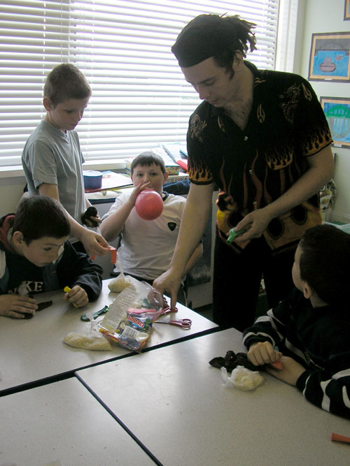 Drinking straw clarinets, fog horns, shakers, carpet tube drums,